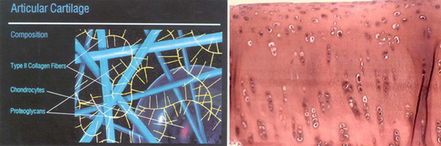 A cartilagem articular hialina compõe-se de células (condrócitos) e uma matriz de colágeno, proteoglicanos e água. O colágeno tipo II é um dos principais componentes da cartilagem, associado a proteoglicanos e glicoproteínas. Sua rede aumenta a resistência tênsil tecidual e contribui para a agregação de macromoléculas.