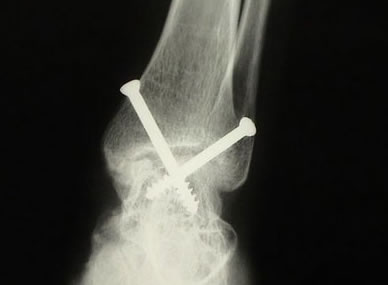 Ressecamos o osteófito anterior para possibilitar a redução do domo talar na articulação do tornozelo. Após preparar a área a ser artrodesada, inserimos dois guias canulados para o drill, um lateralmente através do maléolo lateral e um medialmente, através do maléolo medial. Porém, a angulação dos guias canulados será de 30° inferior e 30° anterior, partindo dos maléolos. Utilizamos fluoroscopia para verificar a posição correta da artrodese. No plano sagital, desejamos a posição neutra de dorsiflexão e flexão plantar do tornozelo e no plano coronal o calcâneo deve estar em 5° de valgo. Finalmente, utilizando parafusos canulados de 6,5mm através do guia, concluímos a artrodese.