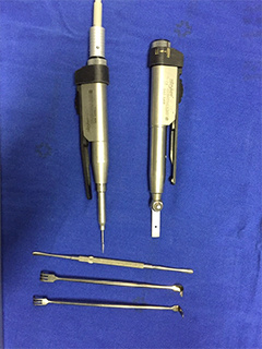 Realizamos a cirurgia percutânea com o auxílio de instrumentos cirúrgicos específicos, incluindo agulhas, pinças e tesouras. Inserimos esses instrumentos pelas pequenas incisões e os guiamos por fluoroscopia (raio-x em tempo real) para executar o procedimento. Geralmente, fazemos a cirurgia sob anestesia local ou sedação, e ela dura de 30 minutos a 1 hora.