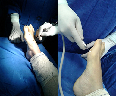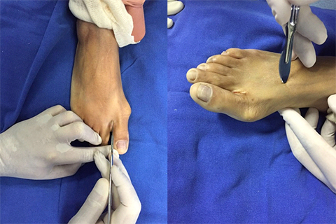 - Tenotomia do tendão flexor curto/longo do hálux: usamos esta técnica para encurtar o tendão e corrigir o dedo em garra.