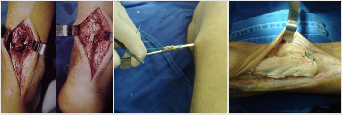 Os melhores resultados para a ruptura do tendão de Aquiles em indivíduos jovens e ativos são obtidos com o tratamento cirúrgico, que envolve a tenografia (sutura do tendão), com ou sem reforço de enxertos locais (tendão fibular curto ou flexor longo do hálux) ou à distância (tendão semitendinoso ou grácil).